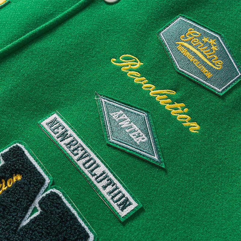 緑と白が印象的なツートーンデザインに、さりげなく施されたワッペンがポイントです。ゆったりとしたビッグシルエットで、男性・女性どちらでもお楽しみいただけます。