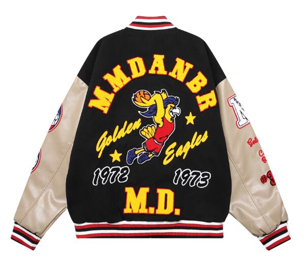 ワッペンのデザインは、バスケットロゴがアクセント。カラフルな配色が目を引き、一枚でも華やかな印象を与えます。ストリートファッションやカジュアルなシーンにぴったりの一着です。