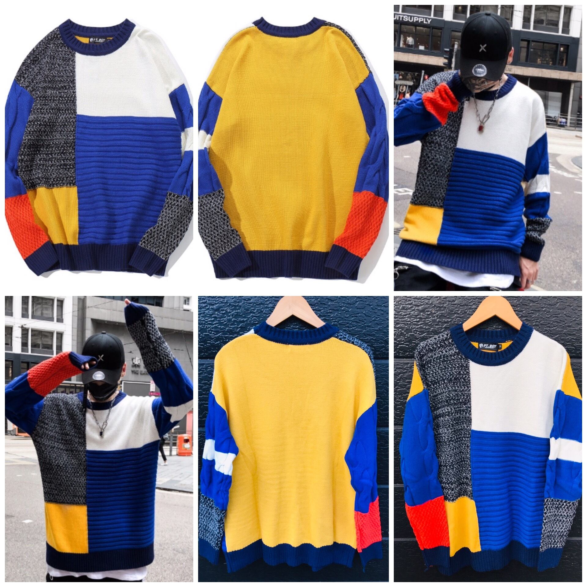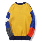 カラフルなパネル切替デザインが特徴のメンズ丸首ニット。